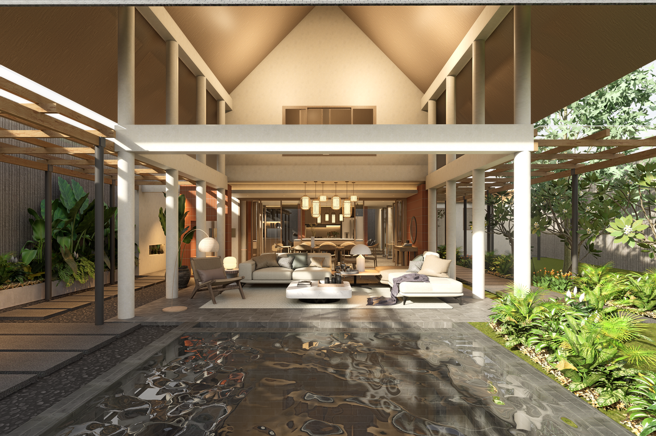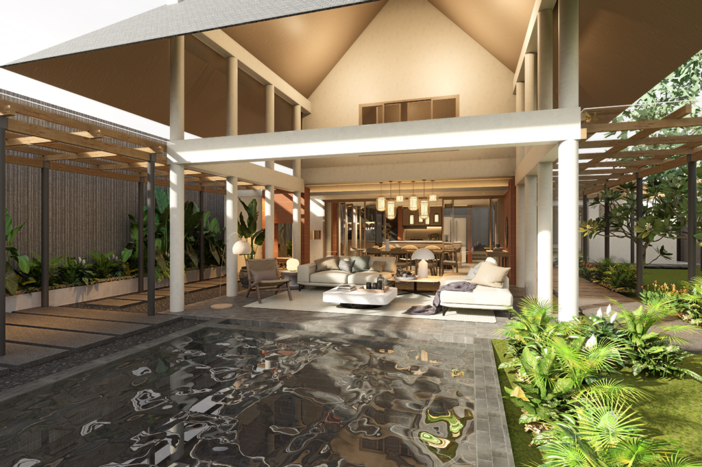 Umalas Residence Renovation is a design proposal for the spatial reconfiguration project of an existing house in Umalas, Bali, originally built in 2005. The design approach focuses on enhancing spatial quality and functionality while respecting the original tropical modern character, including its distinctive pitched roof. The proposal prioritizes maintaining openness, natural light, and cross ventilation as key architectural principles.