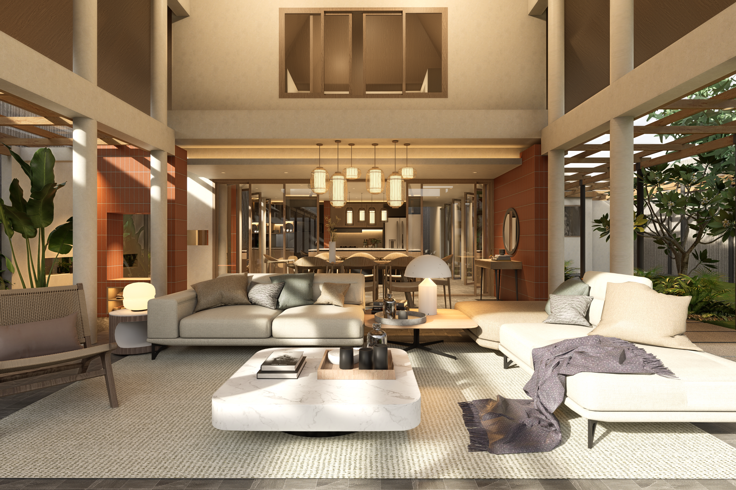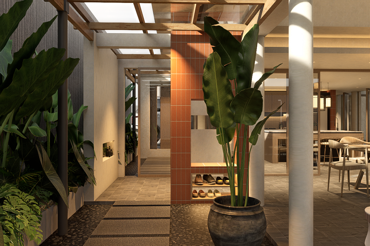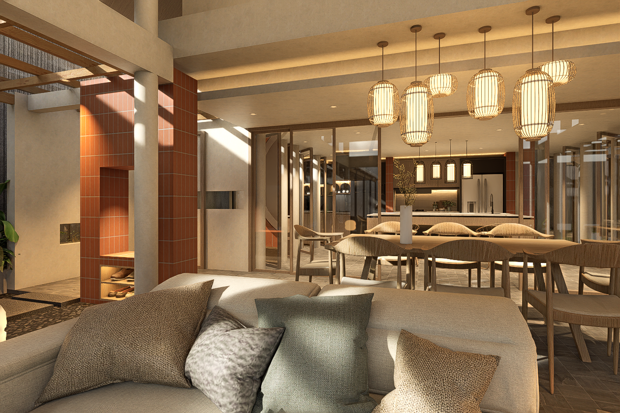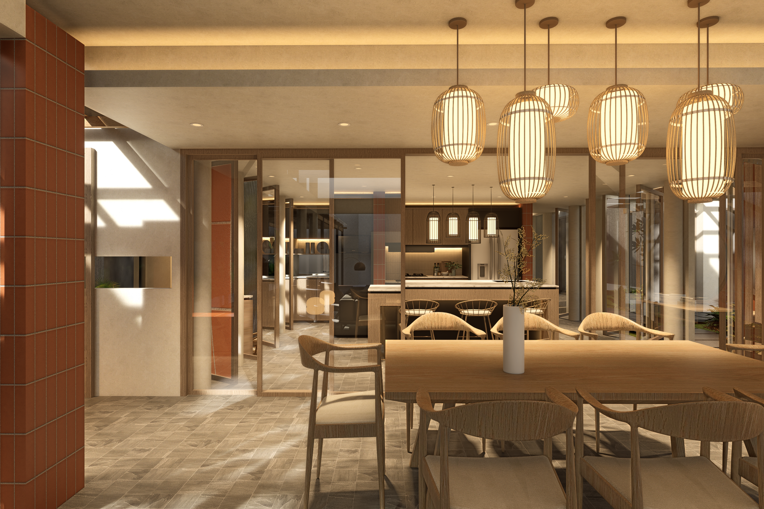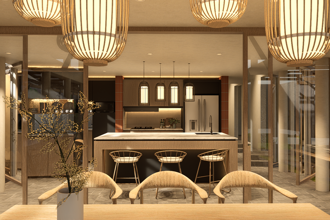 Key interventions are driven by functional and climatic considerations. In the kitchen area, full-height pivot windows are introduced to mitigate rainwater ingress while preserving airflow and visual continuity. A sliding glass partition is added to subtly define indoor and semi-outdoor zones without compromising spatial openness, allowing flexibility in how the space is used.